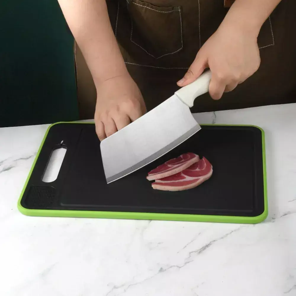 Dupla face: um lado para corte e outro para descongelamento rápido.